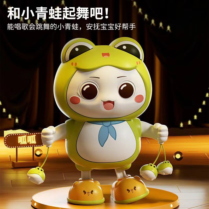 Robot chú ếch xanh mặc áo trắng, thắt nơ xanh dương và đi giày vàng vô cùng ngộ nghĩnh.