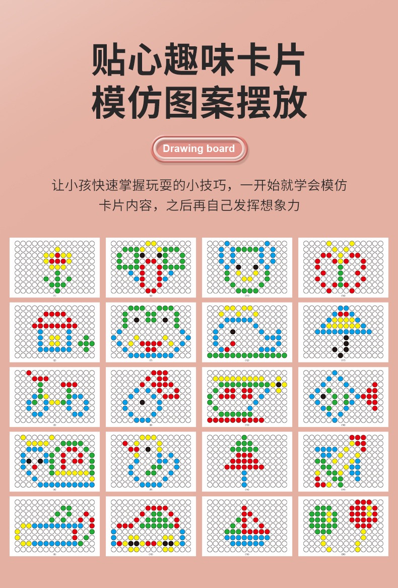 Công nghệ vẽ bằng nam châm: Bé sử dụng bút có đầu nam châm để hút và di chuyển các hạt màu sắc vào từng ô tròn nhỏ trên bảng để tạo hình.