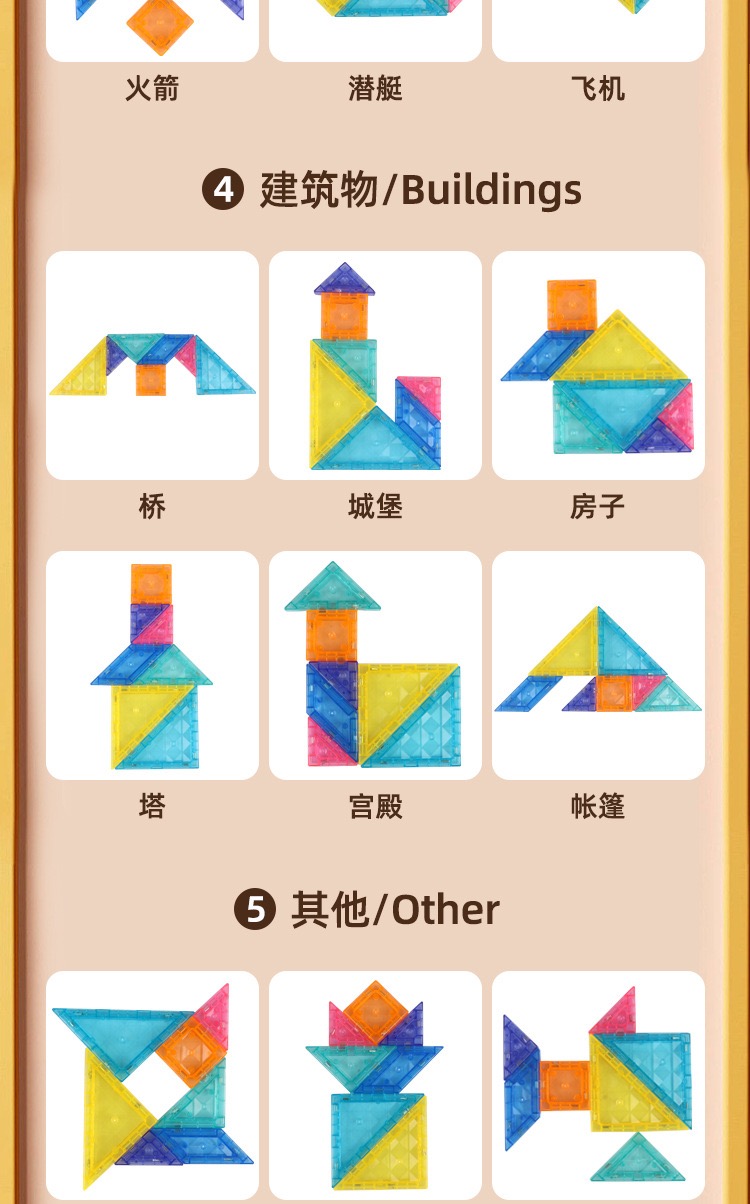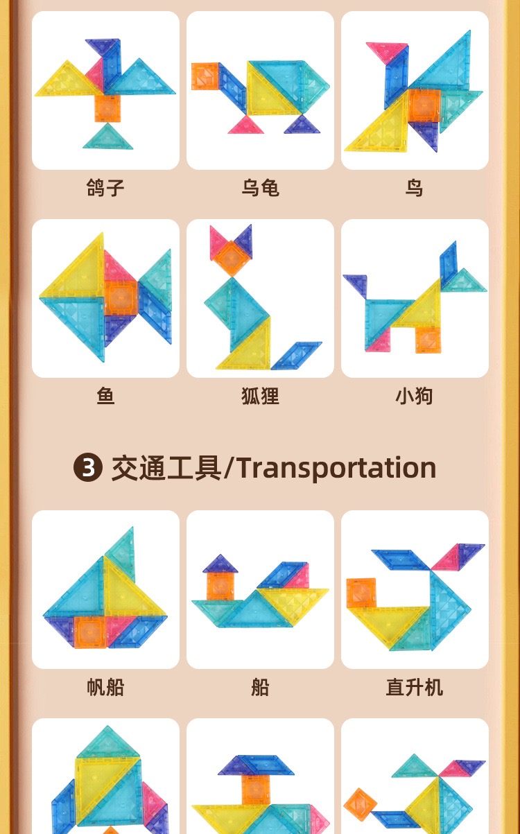 Không chỉ ghép theo mẫu, bé có thể tự do sáng tạo ra các con vật, phương tiện giao thông hay lâu đài theo ý thích.