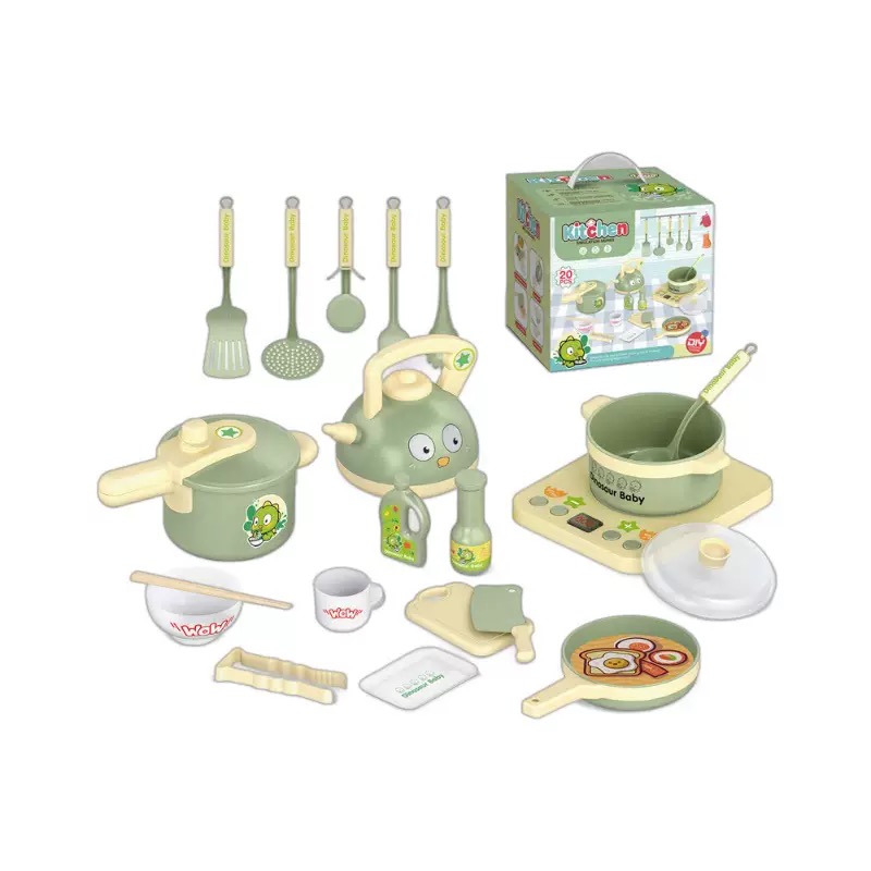 Dụng cụ nấu nướng chuyên dụng: Nồi áp suất và ấm nước có nắp đậy và tay cầm chắc chắn, giúp bé làm quen với các phương pháp chế biến món ăn khác nhau.