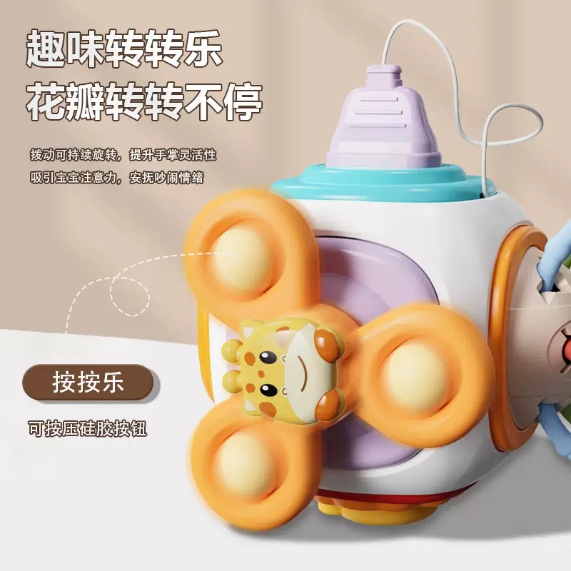Hai bên mặt khối có các chi tiết xoay và nút bấm giúp bé bận rộn khám phá.