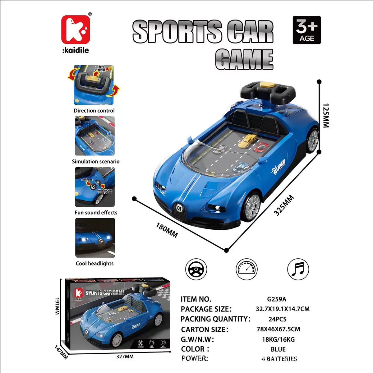 Mô phỏng kiểu dáng siêu xe Bugatti mạnh mẽ với các chi tiết đèn pha và đường nét khí động học tinh xảo.